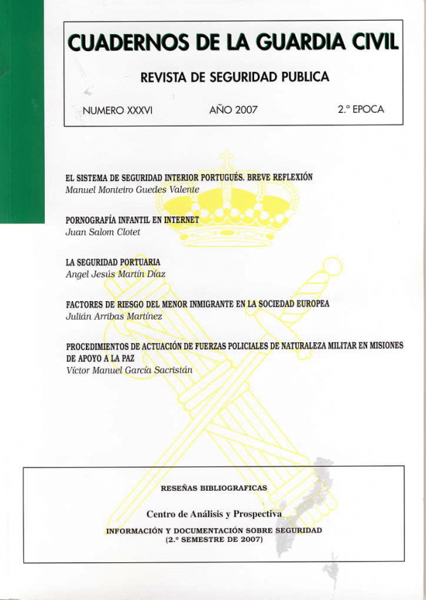 SUMARIO: Manuel Monteiro Guedes Valente: EL SISTEMA DE SEGURIDAD INTERIOR PORTUGUÉS. BREVE REFLEXIÓN -- Juan Salom Clotet: PORNOGRAFÍA INFANTIL EN INTERNET -- Ángel Jesús Martín Díaz: LA SEGURIDAD PORTUARIA -- Julián Arribas Martínez: FACTORES DE RIESGO DEL MENOR INMIGRANTE EN LA SOCIEDAD EUROPEA -- Víctor Manuel García Sacristán: PROCEDIMIENTOS DE ACTUACIÓN DE FUERZAS POLICIALES DE NATURALEZA MILITAR EN MISIONES DE APOYO A LA PAZ.