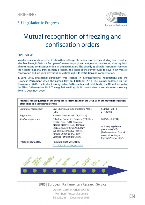 TextSeries: Briefing ; PE 628.225Publication details: European Parliamentary Research Service December 2018Description: 12 p. Recurso onlineSubject(s): Online resources: Summary: In order to respond more effectively to the challenge of criminals and terrorists hiding assets in other Member States, in 2016 the European Commission proposed a regulation on the mutual recognition of freezing and confiscation orders in criminal matters. The directly applicable instrument removes the need for national transposition, broadens the scope of the current rules to cover new types of confiscation and includes provisions on victims' rights to restitution and compensation.