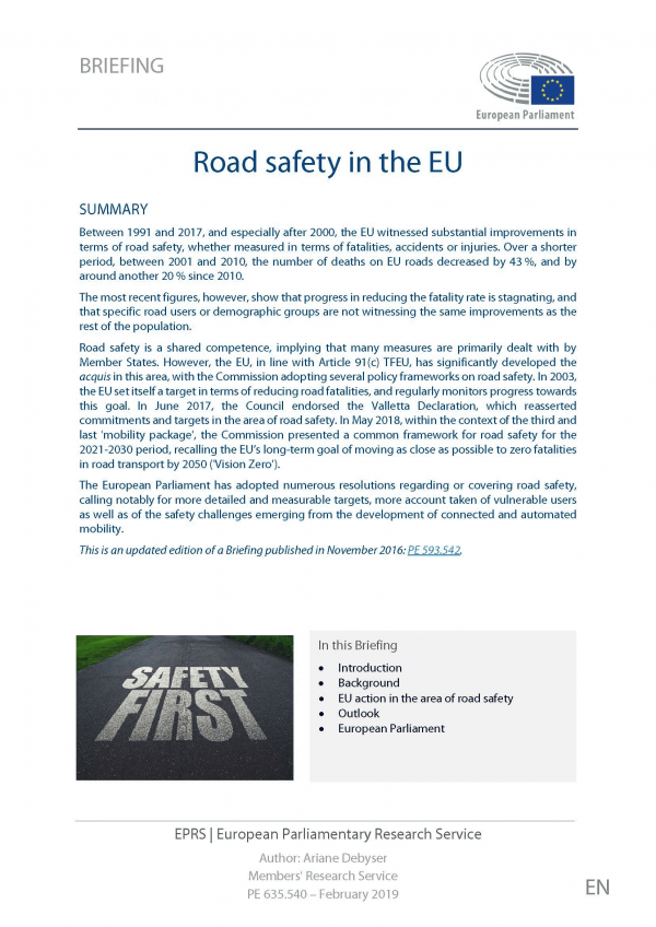 The European Parliament has adopted numerous resolutions regarding or covering road safety, calling notably for more detailed and measurable targets, more account taken of vulnerable users as well as of the safety challenges emerging from the development of connected and automated mobility.