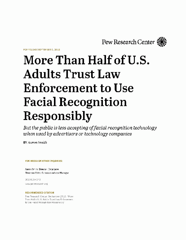More Than Half of U.S. Adults Trust Law Enforcement to Use Facial Recognition Responsibly [Recurso electrónico]PDF : But the public is less accepting of facial recognition technology when used by advertisers or technology companies Internet & Technology