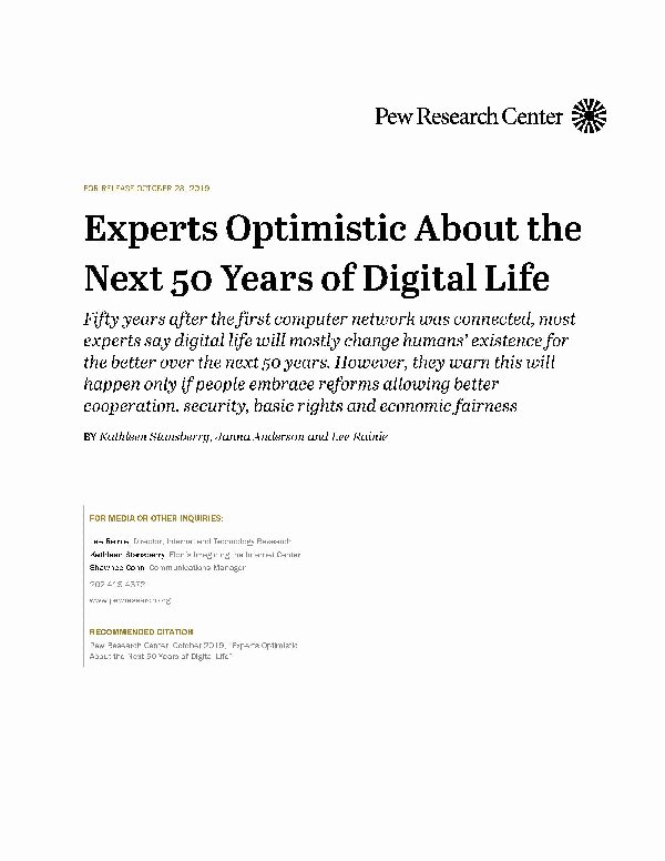 Experts Optimistic About the Next 50 Years of Digital Life [Recurso electrónico] PDF : Fifty years after the first computer network was connected, most experts say digital life will mostly change humans’ existence for the better over the next 50 years. However, they warn this will happen only if people embrace reforms allowing better cooperation, security, basic rights and economic fairness